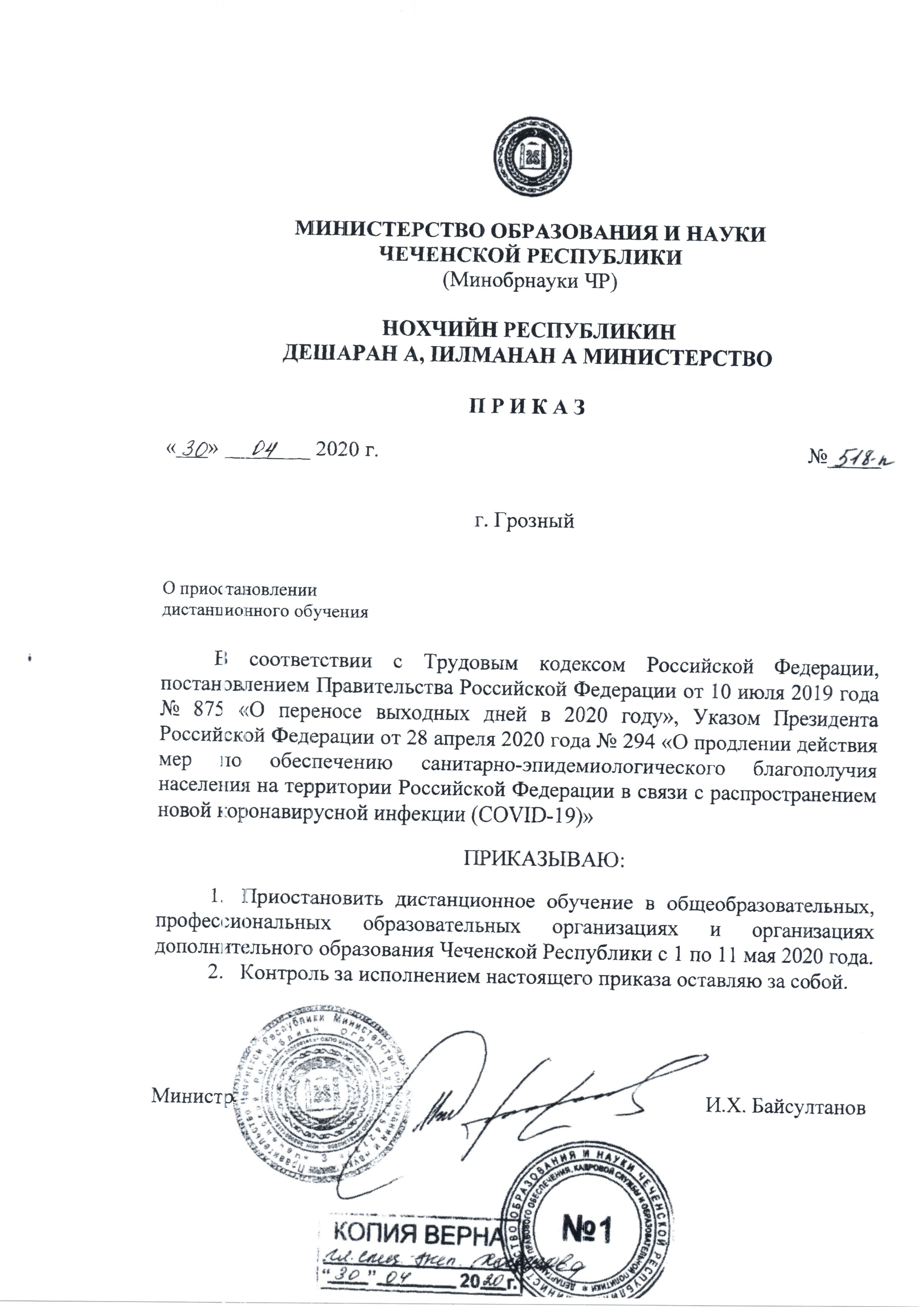 Приказ Министерства образования и науки Чеченской Республики от от 30.04.2020 г. № 518-п "О приостановлении дистанционного обучения"