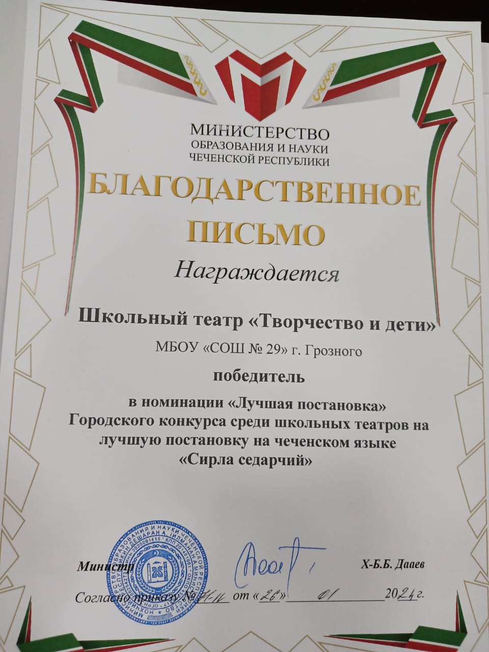 «Я очень рада, что мы стали победителями в этом конкурсе. Да, было очень трудно. Мы очень тщательно готовились, отбирали лучших актеров, но в итоге дети замечательно справились. Нас наградили грамотами, дипломом, вымпелом и денежными средствами на развитие нашего школьного театра «Творчество и дети» от Регионального общественного фонда имени Первого Президента Чеченской Республики, Героя России Ахмата-Хаджи Кадырова (Дала гIазот къобалдойла цуьнан). Мы были лучшими!», - с гордостью сказала руководитель школьного театра Абдулвагапова М.М..