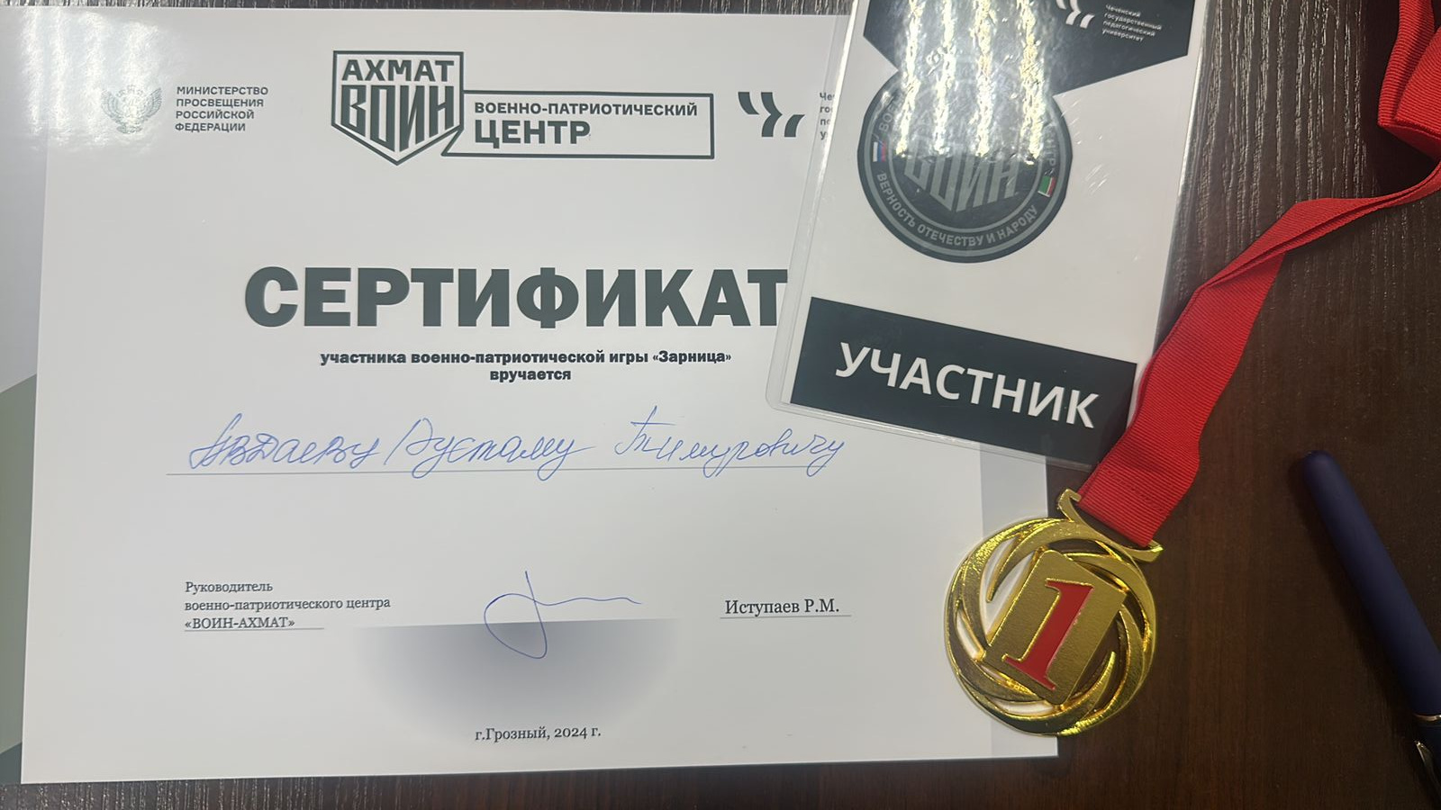 Ученику 11 класса Авдаеву Рустаму вручен сертификат участника военно-патриотической игры "Зарница" и медаль за 1-е место. Рустам всегда стремится быть первым. Он участвует во всех военно- патриотических и спортивных играх. Его стремление и желание получить много знаний на уроках физкультуры, истории и ОБЗР приводит всегда к лучшим результатам.