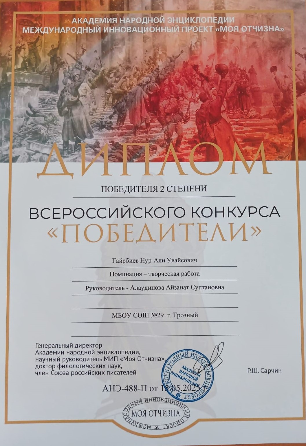 23.05.2025Обучающийся средней школы №29 города Грозного награжден дипломом 2-й степени во Всероссийском конкурсе «Победители».