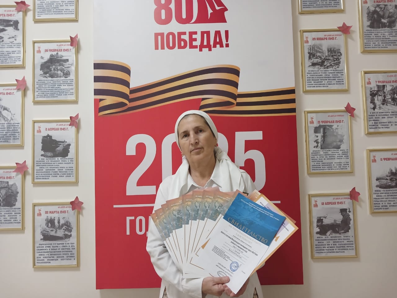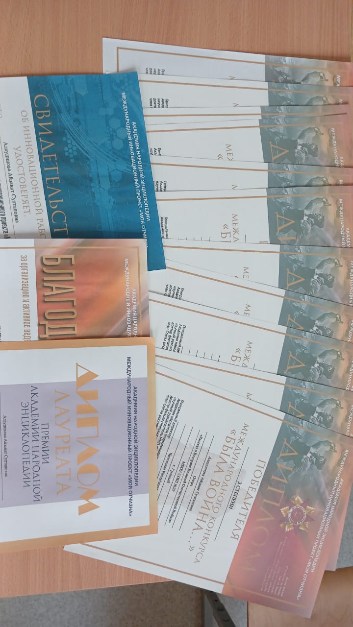На Международный конкурс «Была война…», заместитель директора по воспитательной работе Алаудинова А.С., представила 10 работ по следующим номинациям: видеоролик, сценарий «День Победы», сценарий «80-лет Великой Победе», сценарий «Дети войны», презентация "Ветераны с. Алды г. Грозного», презентация «День Победы», видеопрезентация, исследовательский проект, которые были отмечены дипломами 2-й степени, и два очерка «Рассказ о Ветеране Великой Отечественной войне» дипломами 3-й степени.