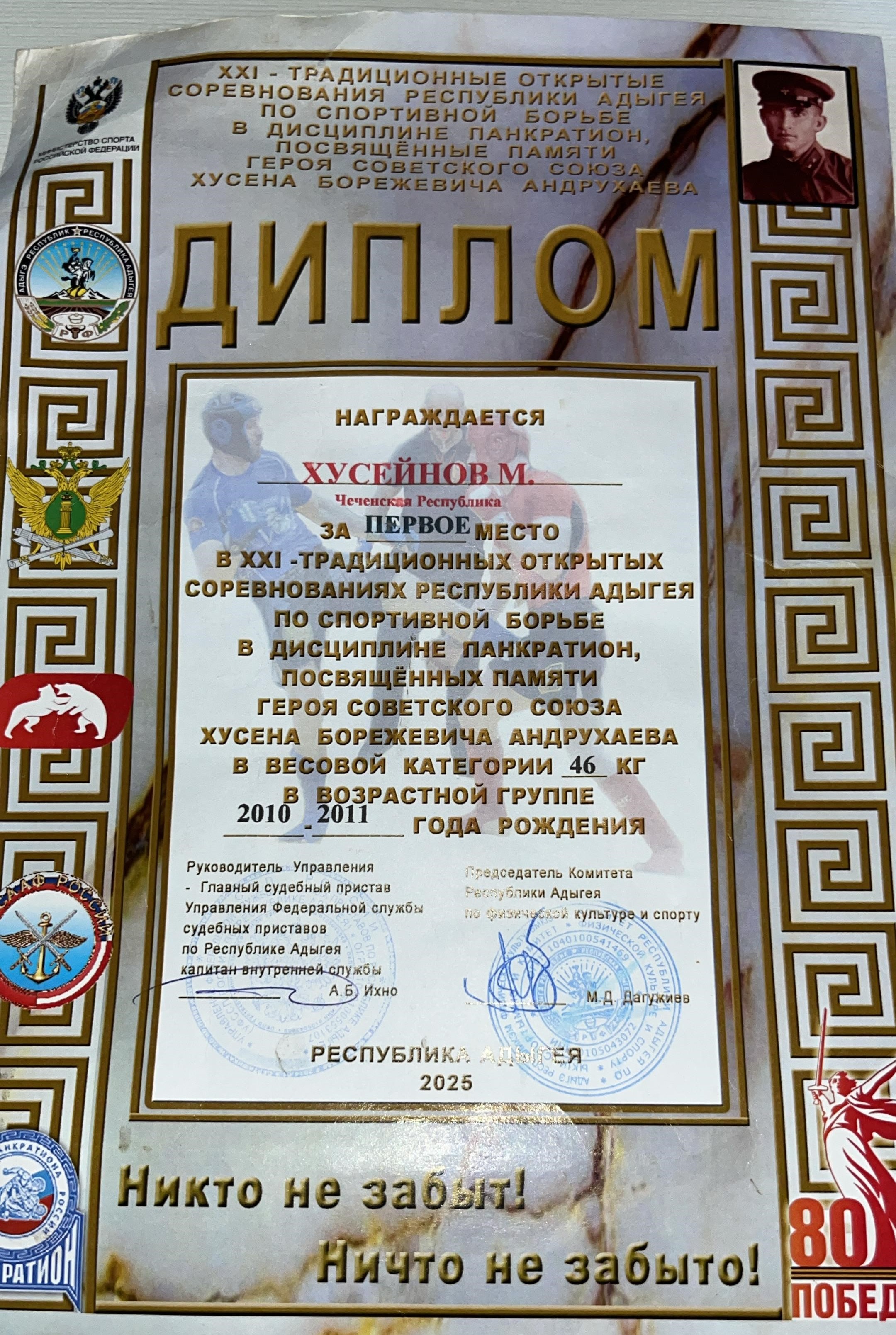 24.07.2025Ученики средней школы №29 города Грозного Мударов Алихан и Хусейнов Мансур, стали победителями в XXI – традиционных открытых соревнованиях Республики Адыгея по спортивной борьбе в дисциплине панкратион, посвященных памяти героя Советского Союза Хусена Борежевича Андрухаева.