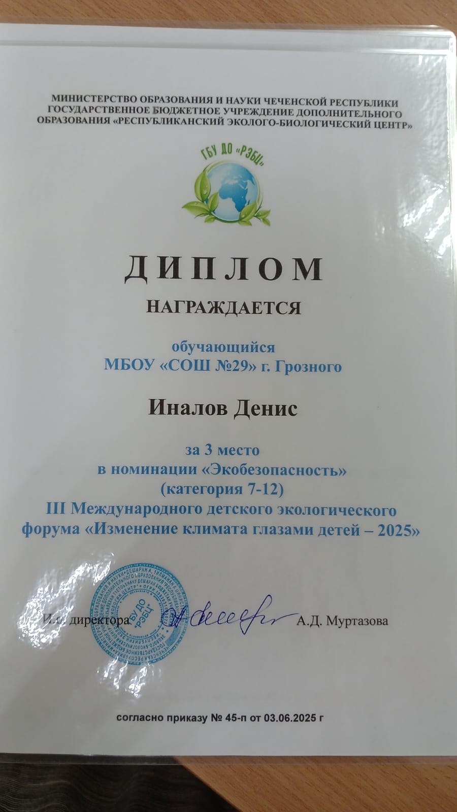 Обучающийся средней школы №29 города Грозного стал призером в региональном этапе IV Международного детского экологического форума «Изменение климата глазами детей - 2025»