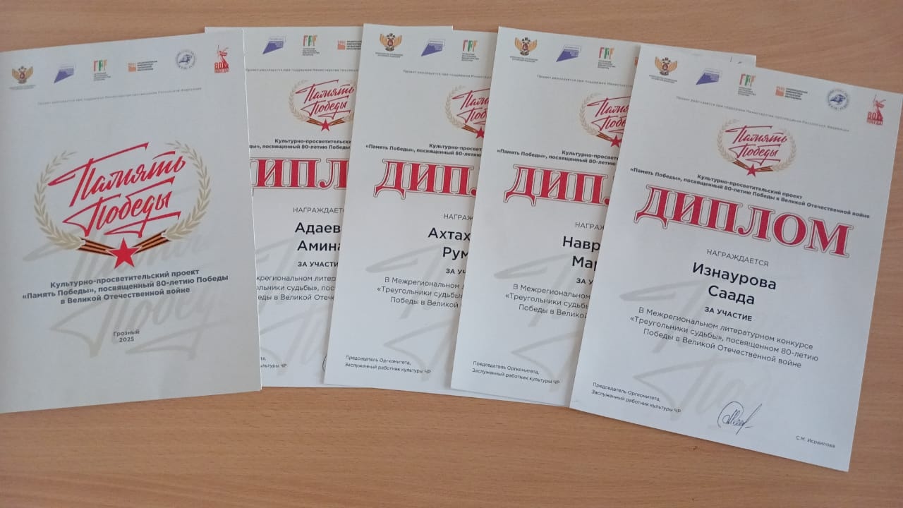 В ходе мероприятия состоялось вручение грамот победителям Межрегионального литературного конкурса «Треугольники судьбы», посвященного 80-летию Победы в Великой Отечественной войне. Нашим учащимся: Адаевой Амине, Ахтахановой Румани, Изнауровой Сааде и Новрузовой Марьям были вручены грамоты за участие.